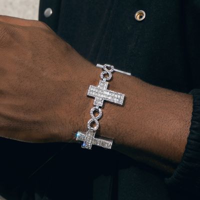 Designed with modern street fashion in mind, 10mm 8″ Baguette Cross Infinity Bracelet in White Gold delivers a strong presence through its iced-out structure and refined detailing.