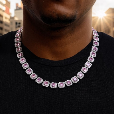 If you’re looking for a chain that blends street style with luxury appeal, the 12mm Handset Pink Clustered Tennis Chain in White Gold is the perfect choice. Ideal for daily wear, gifting, or making a bold fashion statement.