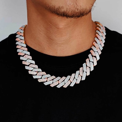 20mm S925 Rose & White Gold Moissanite Prong Cuban Link Chain is a street-luxury piece designed for evening looks, offering timeless elegance with a brilliant moissanite sparkle.