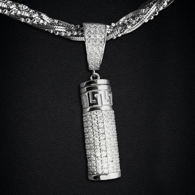 The Cylindrical Swastika Carved Urn Pendant in White Gold features iced brilliance that helps blend street style with luxury appeal. Its design focuses on visual depth, clean detailing, and a finish that feels confident rather than flashy.