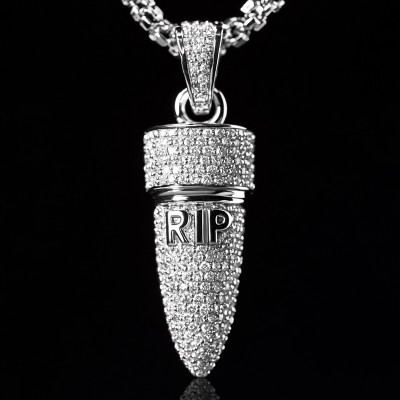 Ideal for those who value individuality and modern luxury, the Iced Bullet RIP Pendant brings personality to your style and elevates your jewelry collection with effortless confidence.