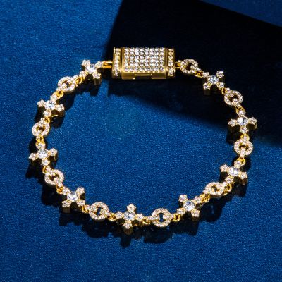 The Iced Circle and Cross Bracelet in Gold is crafted for those who prefer standout wristwear. Its iced-out design and high-polish finish surface create a bold visual impact without sacrificing comfort.