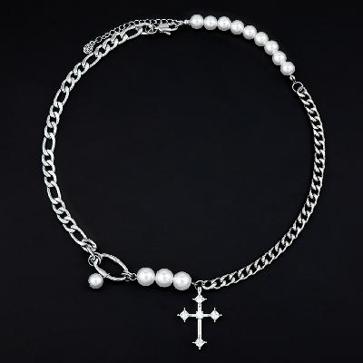 Iced Cross Pearl and Steel Chain Necklace