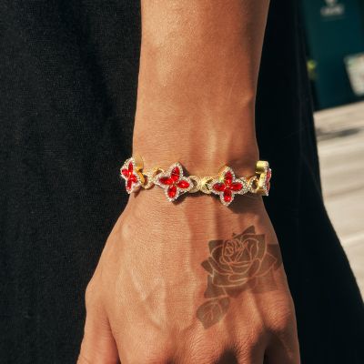 Iced Out 17mm Ruby Clover Bracelet in Gold is a statement bracelet inspired by contemporary hip-hop culture, offering a balance of durability, shine, and everyday wearability.