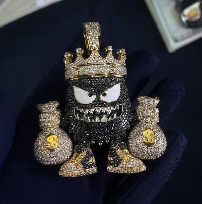 The Iced Out Crown Little Monster Money Bag Pendant features crystal intensity that helps create a strong visual impression. Its design focuses on visual depth, clean detailing, and a finish that feels confident rather than flashy.