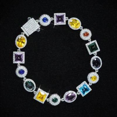 Iced Out Multi Colour Geometric Bracelet in White Gold blends hip-hop inspired aesthetics with sleek reflective surface, making it ideal for everyday wear.