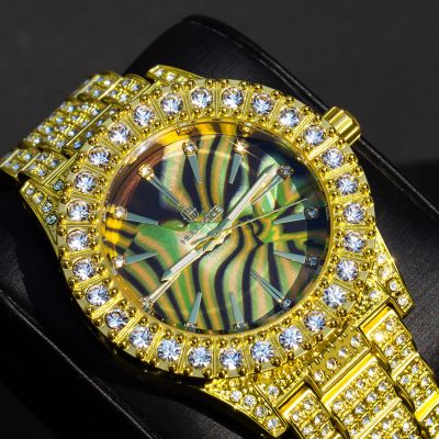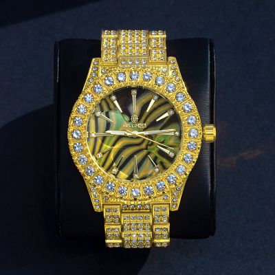 Premium Luxury Iced Multi-color Sea Shell Dial Mens Watch in Gold designed to elevate your style with bold shine, durable build, and everyday luxury appeal.
