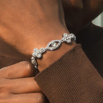 The Round Diamonds Cross with Evil Eyes Bracelet in White Gold is crafted for those who prefer standout wristwear. Its street-luxury design and premium metallic glow surface create a bold visual impact without sacrificing comfort.