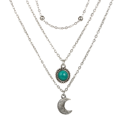 Silver Moon Pendant Beaded Chain Choker Layered Necklace